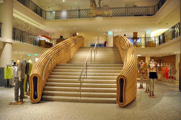 På bunden af det gamle badebasin står nu tre, ni meter høje pavilloner lavet af asketræ, som hver især inderholder forskellige varer, lige fra silketørklæder, til skakspil, glas, møbler, og håndklæder. Det bliver på mange måder næsten ikke finere end Hermès. Men man skal alligevel unde sig selv den oplevelse at gå her ind, og ikke lade sig intimidere af dørmænd, fine damer og fransk shoppearrogance. De har for længst fundet ud af, at man ikke skal skue hunden på hårene, og alle kunder her får en høflig og på alle måder professionel betjening.