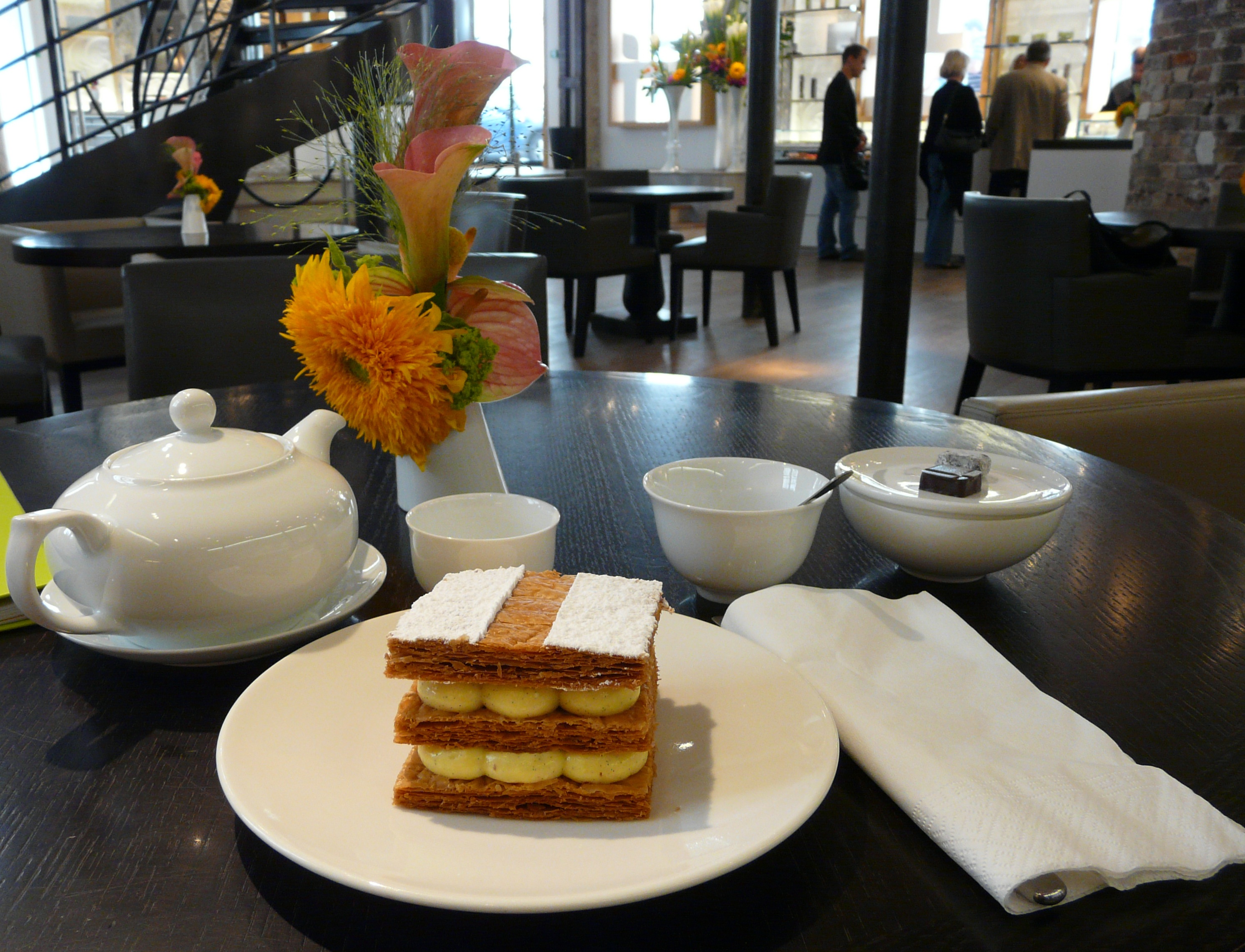 Stedet her er på mange måder meget aristokratisk, designet, moderne og helt gennemtænkt. Butikken i den ene ende af lokalet pakker nænsomt chokolade og frugtflæsk i fine små æsker, mens man i den anden ende af lokalet kan slænge sig i bløde lænestole og bestille utrolig rig varm chokolade og udsøgte kager alt serveret fra et skinnende sølvfad.